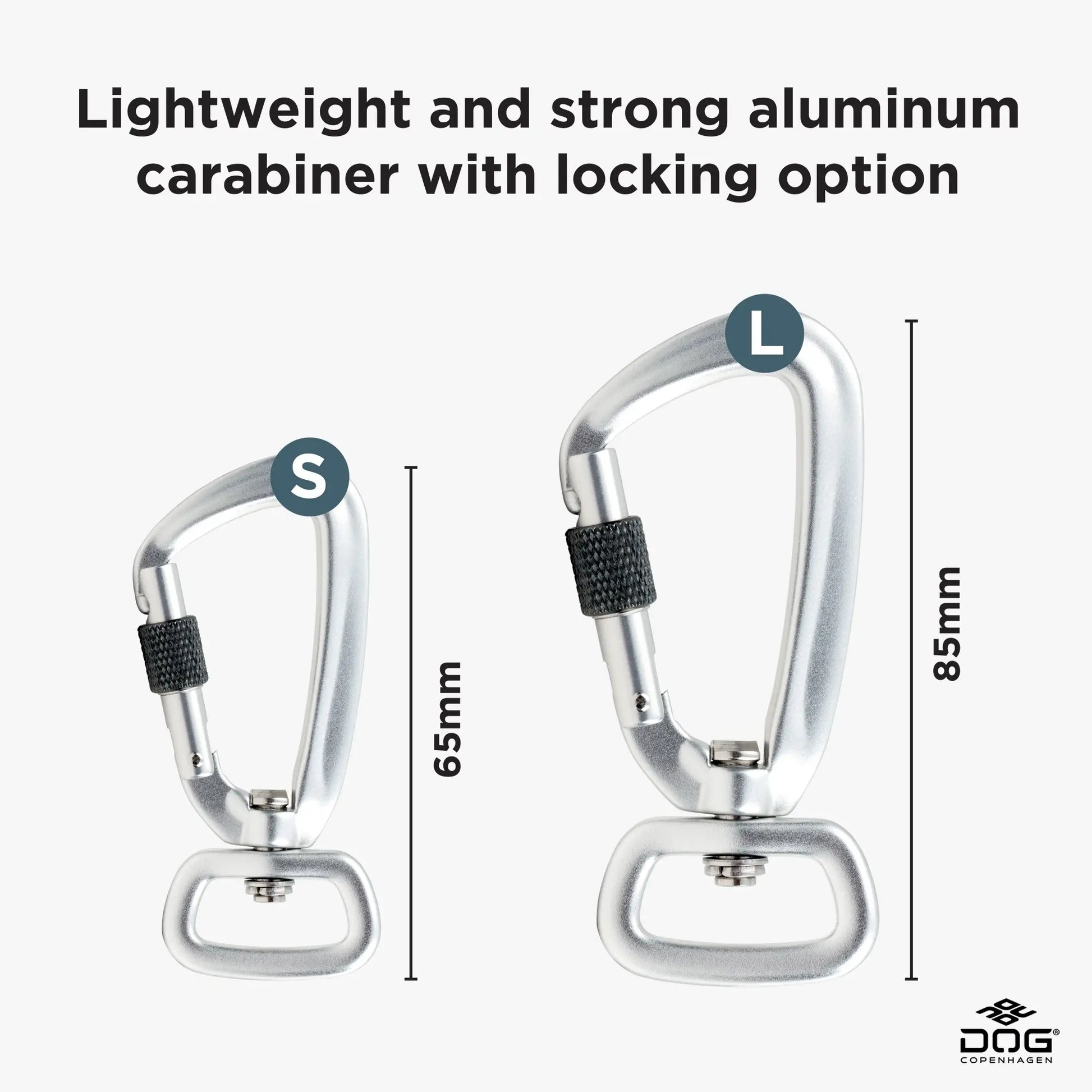 - Let og stærk aluminiums karabinhage med sikkerhedslås – fås i to størrelser for perfekt match til din hund
